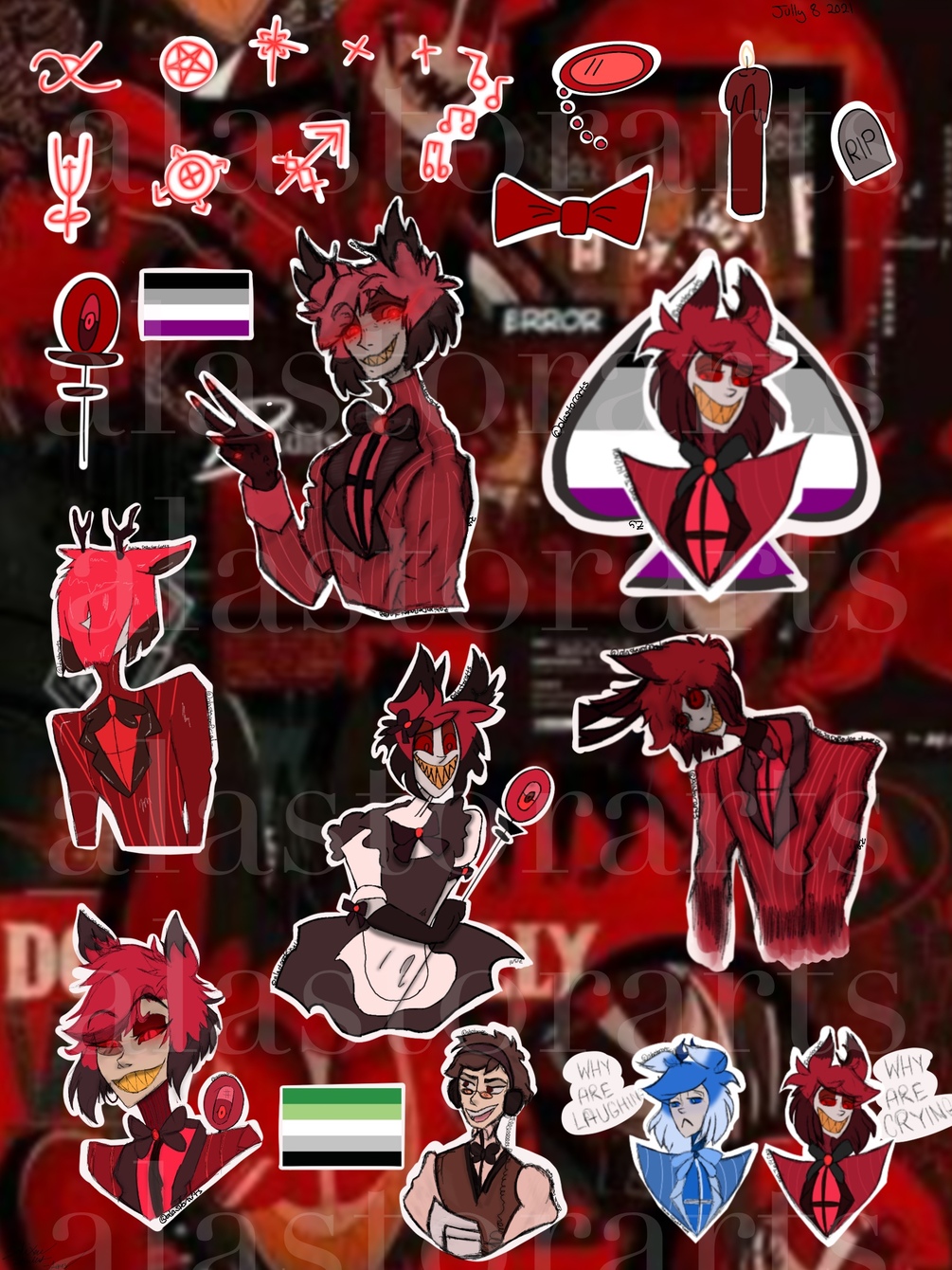 Thank You For Ordering The....27 Pack Of CUSTOM Alastor stickers. 2 pride flags 9 Alastor stickers 11 symbols stickers 4 Other Stickers.